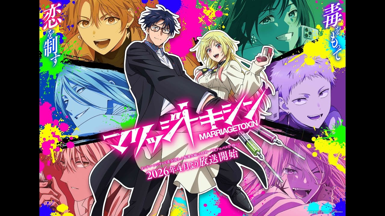 Se a informado que el anime de Marriagetoxin confirmó este martes que la serie se estrenará en abril de 2026 a través de las cadenas Kansai TV y Fuji TV. El anuncio vino acompañado del primer video promocional, un visual clave y la revelación de seis nuevos miembros del elenco que se unen a esta producción de Studio Bones.