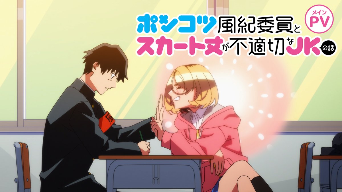 Se informa que el anime de Ponkotsu Fuukiin to Skirt Take ga Futekisetsu na JK no Hanashi (conocido en inglés como Story of the Useless Public Morals Committeeman and the High School Girl With Inappropriate Skirt Length) actualizó su información este lunes con un nuevo video promocional y una imagen visual. El comité de producción aprovechó la revelación para confirmar que la serie comenzará su emisión en la televisión el próximo 6 de abril.